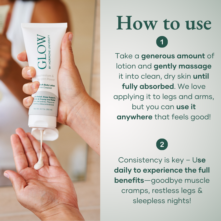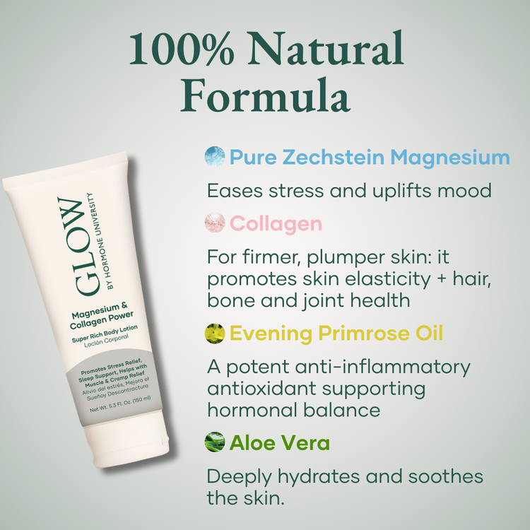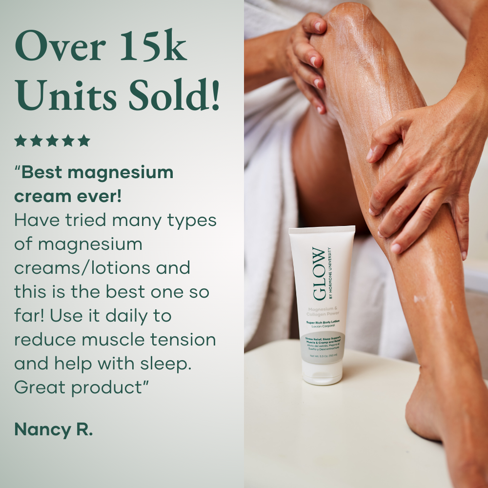 Magnesium in our Super Rich Magnesium Body Lotion promotes muscle relaxation, reduces muscle cramps, and supports cellular energy production. Collagen improves skin elasticity, reduces fine lines, and supports joint health. Together, they provide comprehensive anti-aging benefits while promoting hormonal balance and sleep quality through topical magnesium absorption.